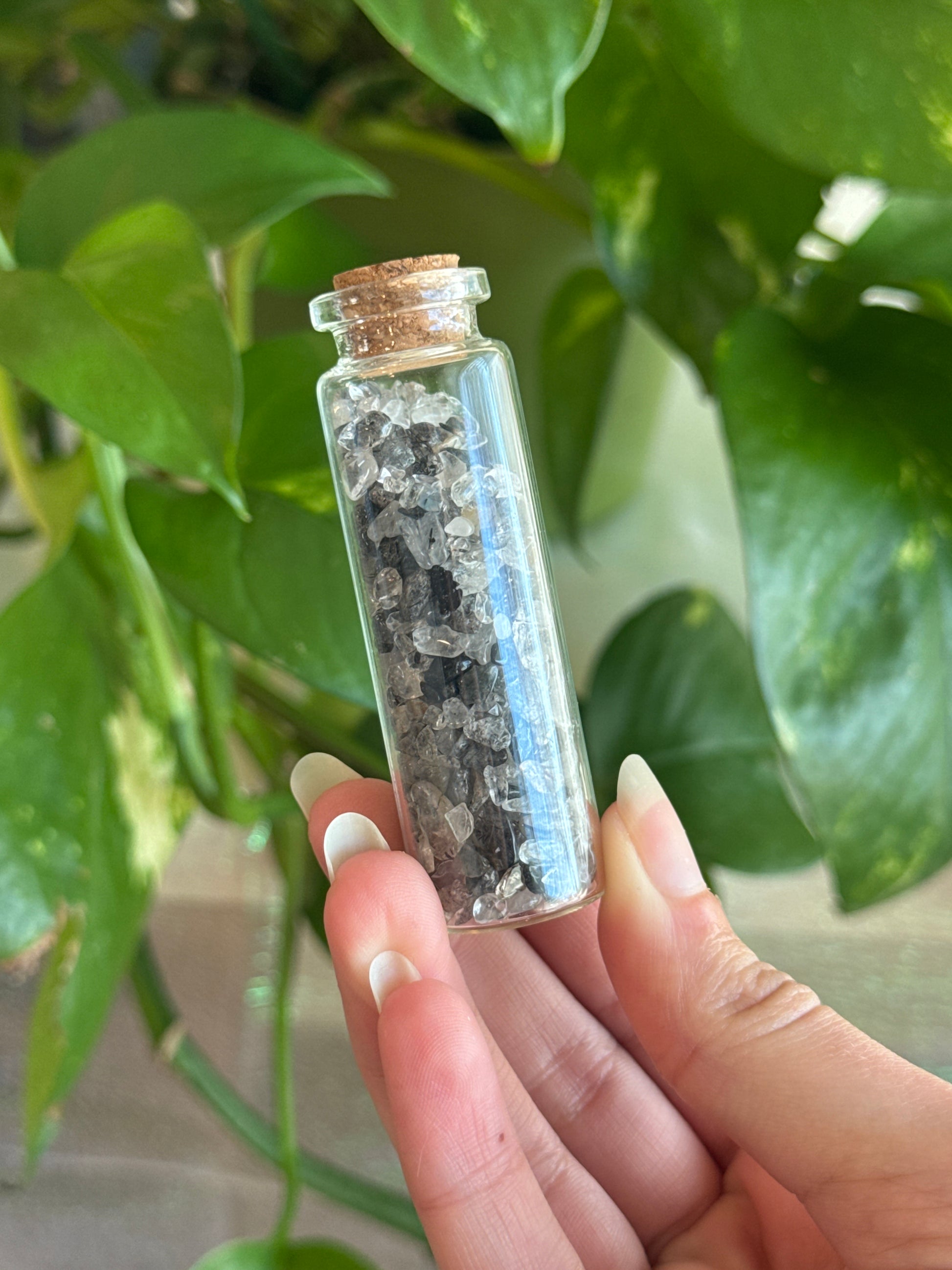About a 2.5 in tall glass bottle filled with crystal chips