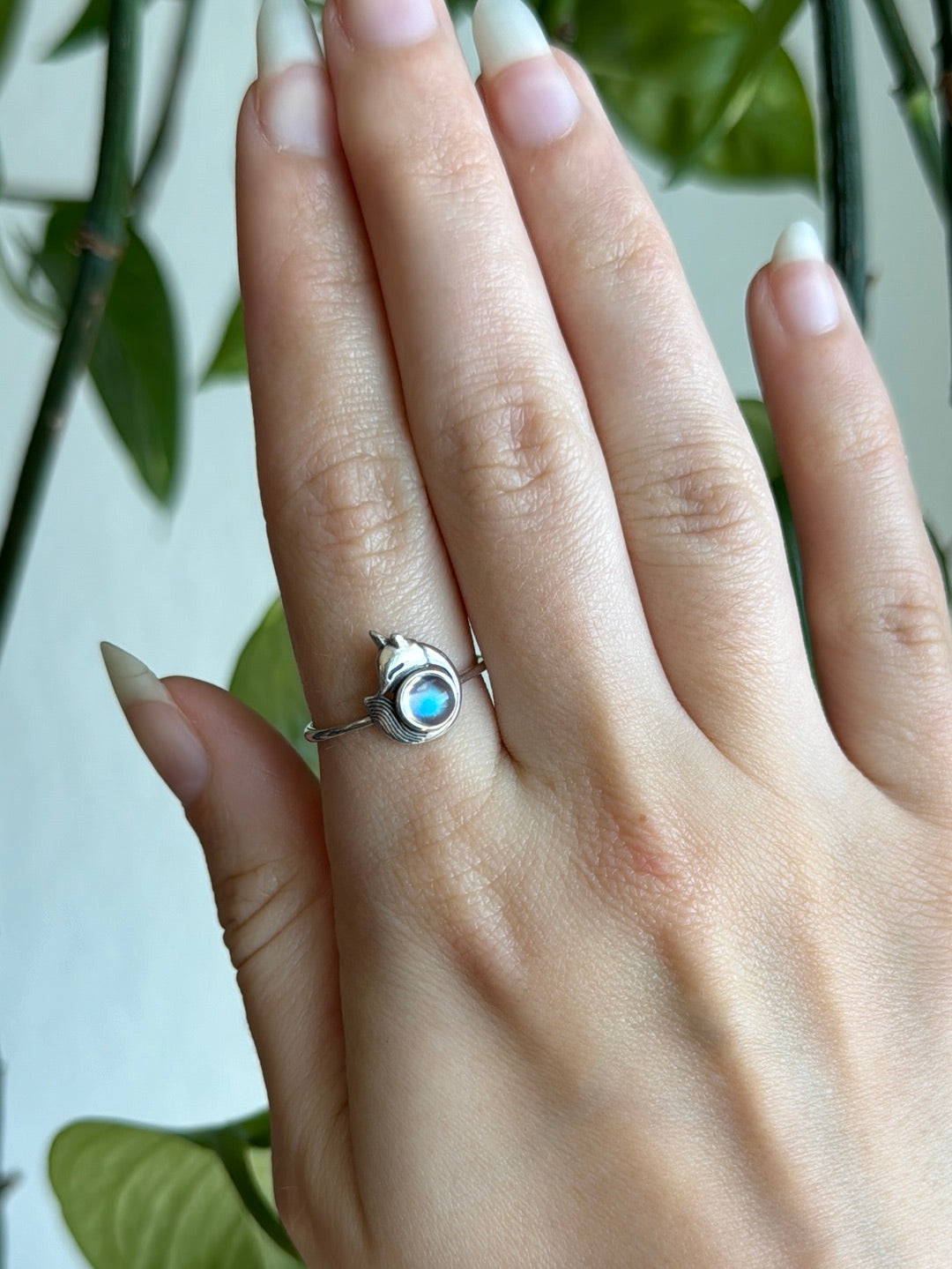 Moonstone Sleepy Fox 925 Sterling Silver Adjustable Ring